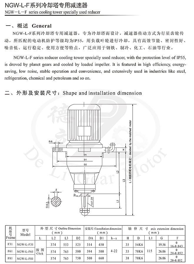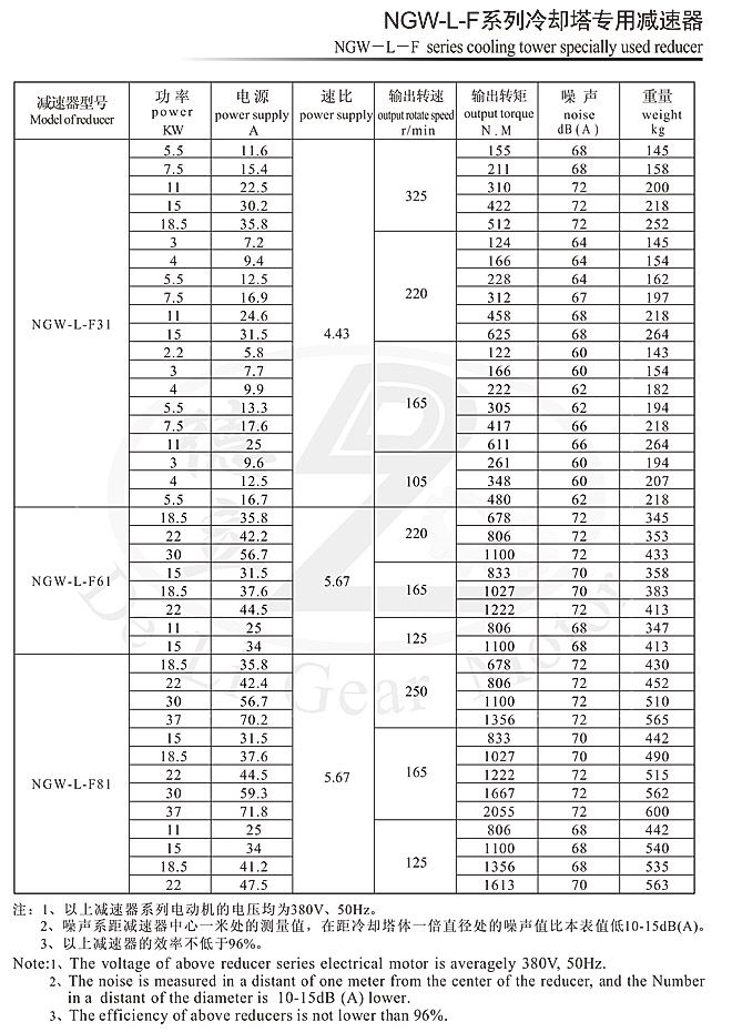 NGW-L-F系列冷卻塔專用減速器系上海交通大學(xué)設(shè)計,是專門為配套200~750T/n冷卻塔設(shè)計的新產(chǎn)品,其主要結(jié)構(gòu)為立式單級行星傳動。齒輪采用合金鋼經(jīng)高精度切削加工熱處理而成,具有強(qiáng)度高、韌性好、精度高等優(yōu)點(diǎn),同時采用浸油式潤滑,且在密封方面作了改進(jìn),從而達(dá)到了噪音低、振動小、效率高、不漏油、壽命長的目的。己成為冷卻塔節(jié)能降噪的最理想產(chǎn)品,被廣泛用于化工、輕工、醫(yī)藥、冶金、高級賓館、民用建筑等行業(yè)。